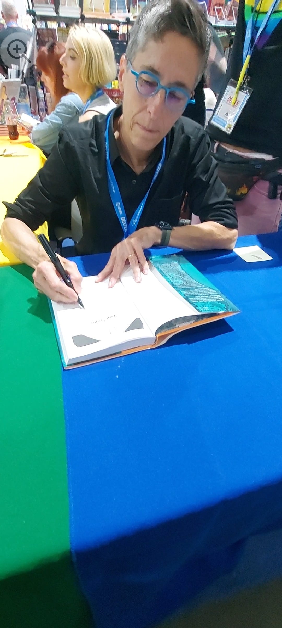 It's the human manning Alison Bechdel's line at Prism Comics saying, “I've volunteered for Prism for years. I've never seen a line like this here.”